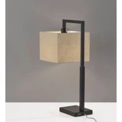With a clean, minimalist shape and a simple color palette, the 25″ tall Richard table lamp exudes modern style. It features a black metal rectangular base measuring 5.5″ by 8″. The black finish continues up the narrow rectangular stem leading to a square, beige textured fabric shade that softly distills the light. For convenient access to AC power on your table or desk, the base includes an outlet subtly located on the back. The 60W bulb (not included) is operated by a rotary switch located on the socket, and the lamp features a 5′ clear cord. Complete your space’s look with the coordinating Richard floor lamp.