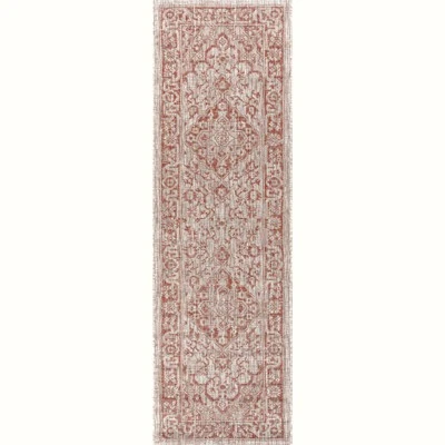 This ornate medallion rug’s lively pattern adds dreamy Bohemian style to an outdoor porch or patio. Varied tones of taupe mingled with a rusty-red pattern give this rug a hand-woven, vintage vibe. The flatweave design is great for high-traffic spaces indoors too.
