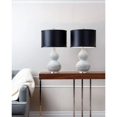 Turn on luxe style with the Abbyson Living Sayer Table Lamps. This stunning pair of table lamps features hourglass curves and a glossy silver finish. The beaded exterior of the bases provide texture and dimension, making these a perfect choice of accent to add visual interest to any room. Metallic silver finish hardware and a pedestal base, along with a satin black drum shade complete the look of this pair of stunning table lamps with symmetry. The perfect pair for a modern living room, formal dining area, or to add a dash of much needed drama to any space.