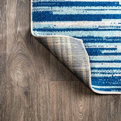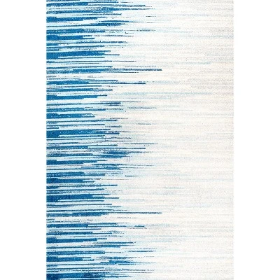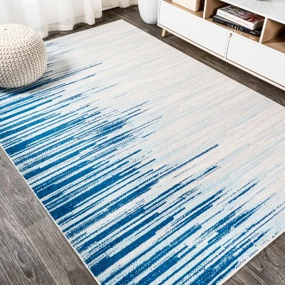 - Deep blue against a soft gray and ivory background gives this rug its modern striped look