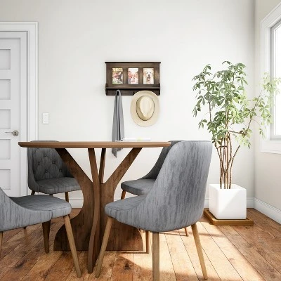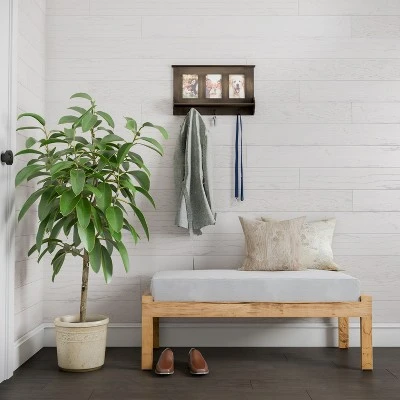 Combine the best of style and function with the Hastings Home Wall Shelf with Photo Collage Frames. The versatile accent piece allows you display your favorite pictures or artwork, while gaining practical storage space for items like keys, hats, scarves, light jackets, dog leashes, jewelry, handbags and more! The shelf even has a ledge for added storage and organization space. The distressed wood-look of the shelf complements most color palettes in any home or office, and can add a modern farmhouse or rustic feel to your decor. With 3 hanging hooks, and 3 4×6 picture frames, this piece is perfect to hang by your entryway or foyer. It’s also ideal for your kitchen, bathroom, bedroom, stairway and in spaces where you’d like a charming decorative storage. With no assembly required and the screws and anchors for mounting included, this piece will be ready to make an impact in your home in just minutes! . This product contains chemicals known to the state of California to cause cancer, birth defects, or other reproductive harm. https://www.p65warnings.ca.gov