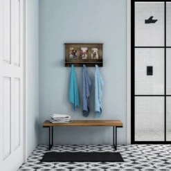 - PRODUCT DETAILS- Dimensions: 19-in x 3.5-in x 11.5-in, Material: MDF wood, hand painted with distressed finish, 3 metal hooks and 3 picture 4×6 picture frames, Max weight capacity per hook: 2 lbs, Comes with screws and anchors