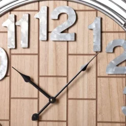 - The industrial design featuring faux wood tiles and galvanized metal, makes this a statement wall clock.